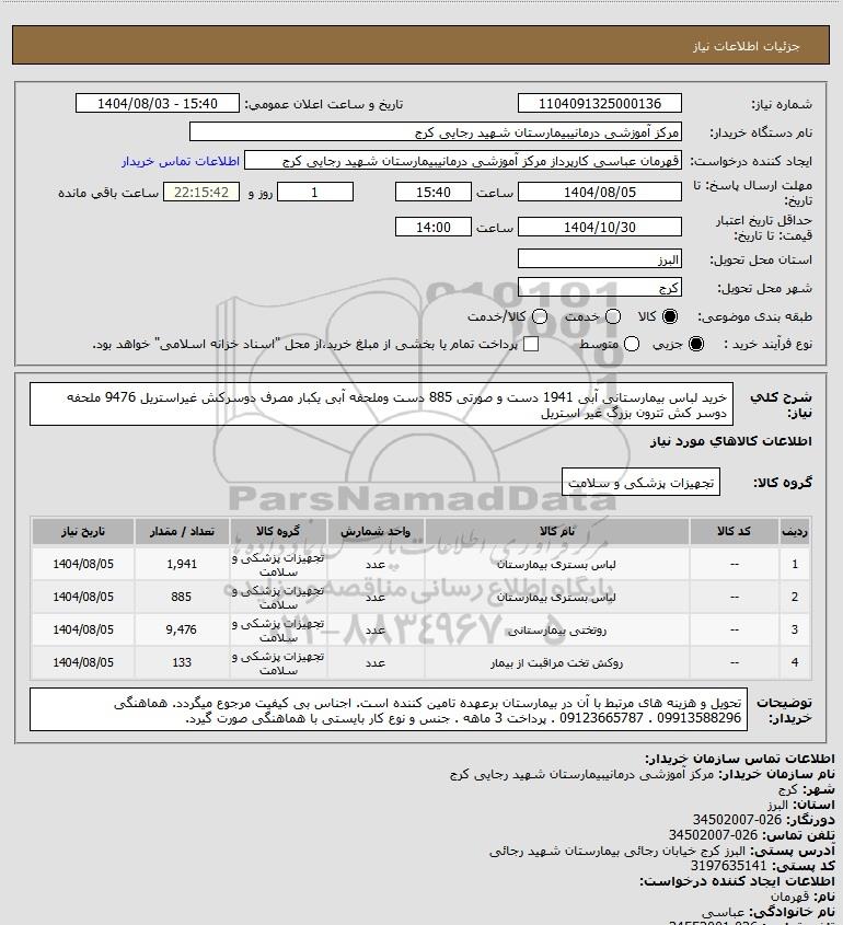 | 2 | -- | لباس بستری بیمارستان | عدد | تجهیزات پزشکی و سلامت | 885 | 1404/08/05 |