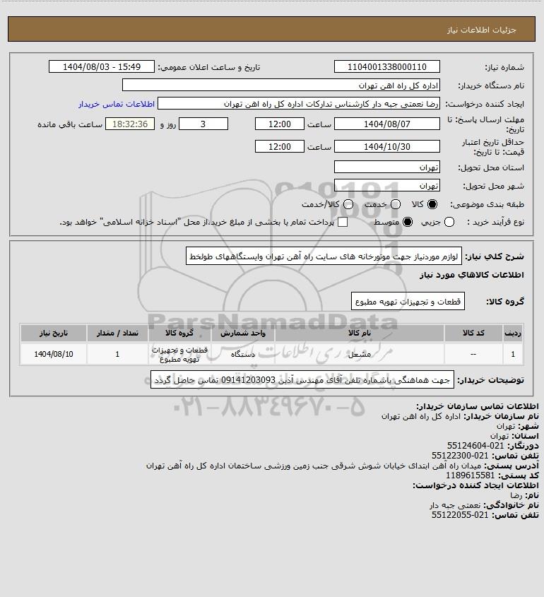 شرح کلی نیاز: لوازم موردنیاز جهت موتورخانه های سایت راه آهن تهران وایستگاههای طولخط