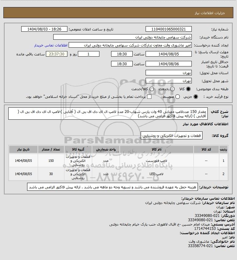 شرح کلی نیاز: مقدار 150 عددلامپ مهتابی 40 وات پارس شهاب-20 عدد لامپ ال ای دی اف بی ال ( آفتابی )-لامپ ال ای دی اف بی ال ( آفتابی ) (ارائه پیش فاکتور الزامی می باشد)