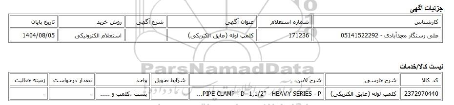 | علی رستگار محمدآبادی - 05141522292 | 171236 | کلمپ لوله (عایق الکتریکی) | استعلام الکترونیکی | 1404/08/05 |