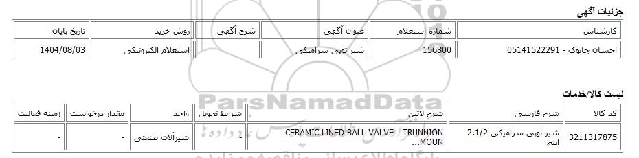 | احسان چابوک - 05141522291 | 156800 | شیر توپی سرامیکی | استعلام الکترونیکی | 1404/08/03 |