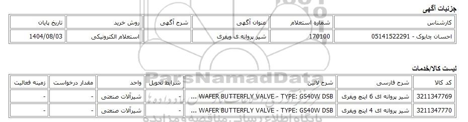 احسان چابوک - 05141522291170100شیر پروانه ی ویفریاستعلام الکترونیکی1404/08/03