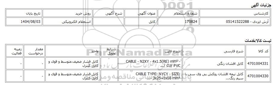 آرش ایزدی - 05141522288170824کابلاستعلام الکترونیکی1404/08/03