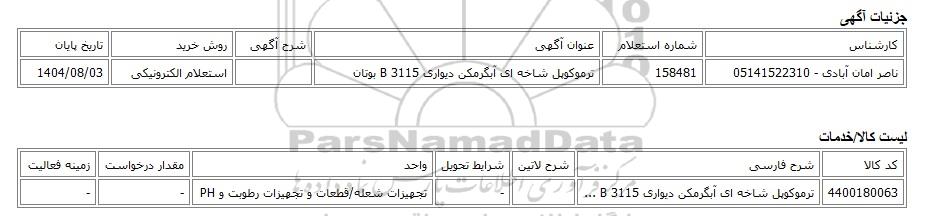ناصر امان آبادی - 05141522310158481ترموکوپل شاخه ای آبگرمکن دیواری B 3115 بوتاناستعلام الکترونیکی1404/08/03