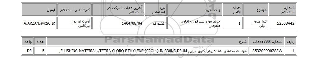 | 52503442 | تترا کلرور اتیلن | 1 | خرید مواد مصرفی و اقلام عمومی | کشوری | 1404/08/04 | آرمان ارزانی بیرگانی | A.ARZANI@KSC.IR |