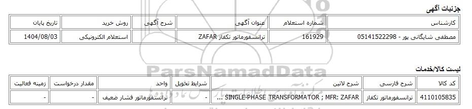 | مصطفی شایگانی پور - 05141522298 | 161929 | ترانسفورماتور تکفاز ZAFAR | استعلام الکترونیکی | 1404/08/03 |