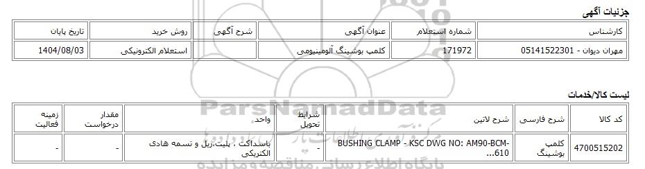 | مهران دیوان - 05141522301 | 171972 | کلمپ بوشینگ آلومینیومی | استعلام الکترونیکی | 1404/08/03 |