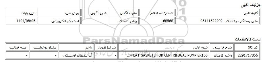 | علی رستگار محمدآبادی - 05141522292 | 168568 | واشر کاغذی | استعلام الکترونیکی | 1404/08/05 |