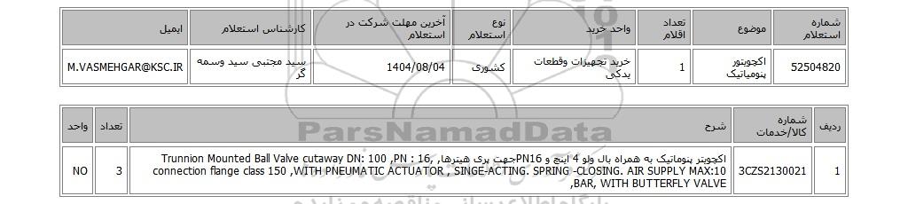 | 52504820 | اکچویتور پنومیاتیک | 1 | خرید تجهیزات وقطعات یدکی | کشوری | 1404/08/04 | سید مجتبی سید وسمه گر | M.VASMEHGAR@KSC.IR |
