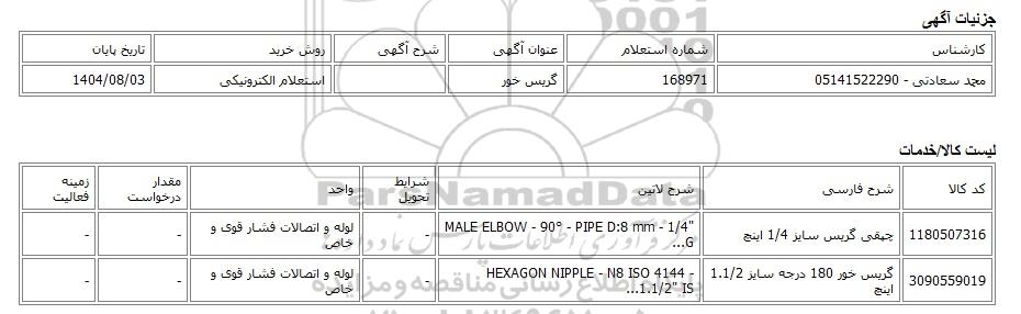 | محمد سعادتی - 05141522290 | 168971 | گریس خور | استعلام الکترونیکی | 1404/08/03 |