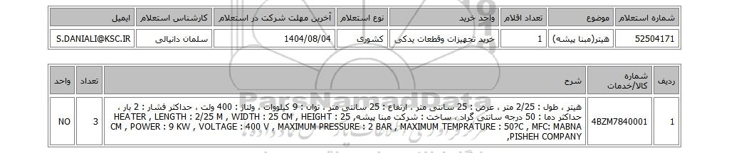 | 52504171 | هیتر(مبنا پیشه) | 1 | خرید تجهیزات وقطعات یدکی | کشوری | 1404/08/04 | سلمان دانیالی | S.DANIALI@KSC.IR |