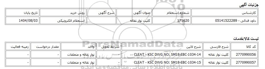| داود فدائی - 05141522289 | 171620 | کلیت نوار نقاله | استعلام الکترونیکی | 1404/08/03 |