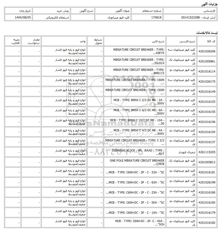| آرش ایزدی - 05141522288 | 170818 | کلید فیوز مینیاتوری | استعلام الکترونیکی | 1404/08/05 |