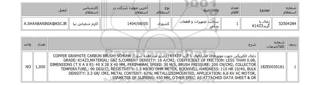 | 52504284 | زغال با گریدK14Z3 | 1 | ساخت تجهیزات و قطعات یدکی | کشوری | 1404/08/05 | اکرم شعبانی نیا | A.SHAABANINIA@KSC.IR |