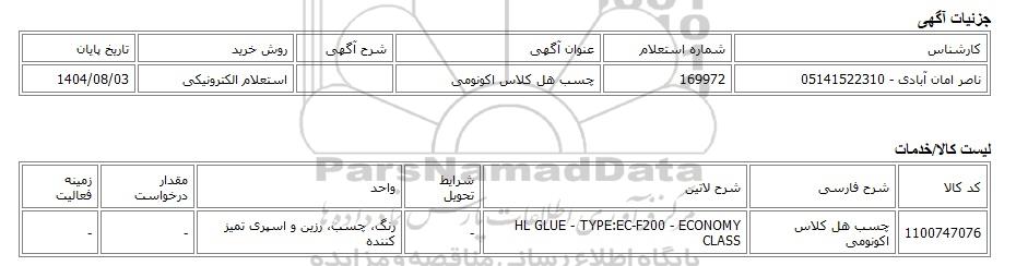 | ناصر امان آبادی - 05141522310 | 169972 | چسب هل کلاس اکونومی | استعلام الکترونیکی | 1404/08/03 |