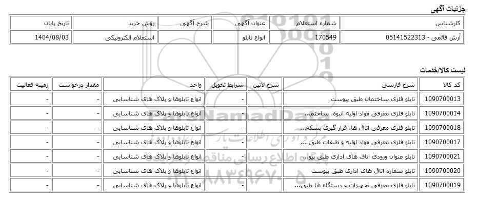 | آرش قائمی - 05141522313 | 170549 | انواع تابلو | استعلام الکترونیکی | 1404/08/03 |
