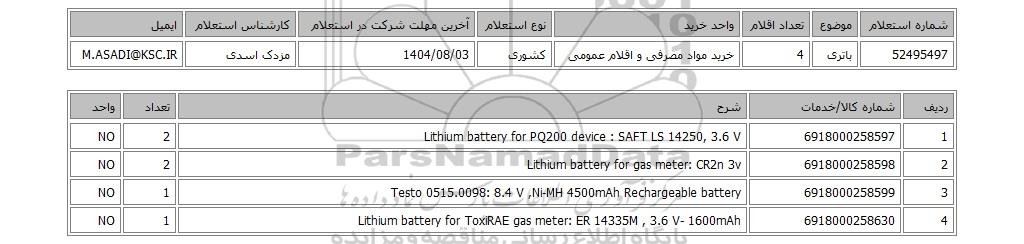 52495497باتری4خرید مواد مصرفی و اقلام عمومیکشوری1404/08/03مزدک اسدیM.ASADI@KSC.IR
