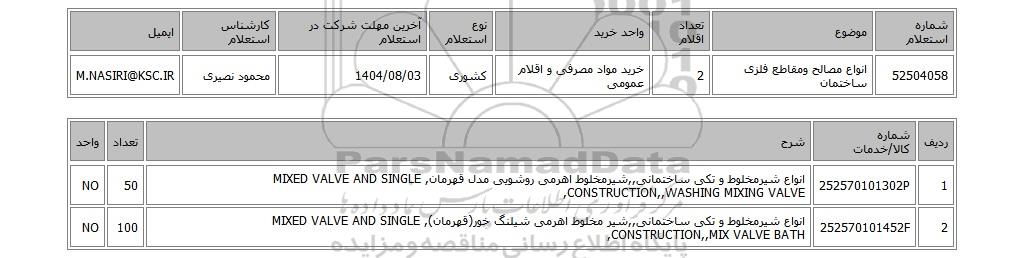 | 52504058 | انواع مصالح ومقاطع فلزی ساختمان | 2 | خرید مواد مصرفی و اقلام عمومی | کشوری | 1404/08/03 | محمود نصیری | M.NASIRI@KSC.IR |