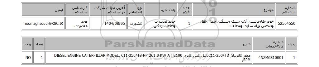 | 52504550 | خودروهاوماشین آلات سبک وسنگین حمل ونقل وصنعتی وراه سازی ومتعلقات | 1 | خرید تجهیزات وقطعات یدکی | کشوری | 1404/08/05 | محمد مقصودی | mo.maghsoudi@KSC.IR |