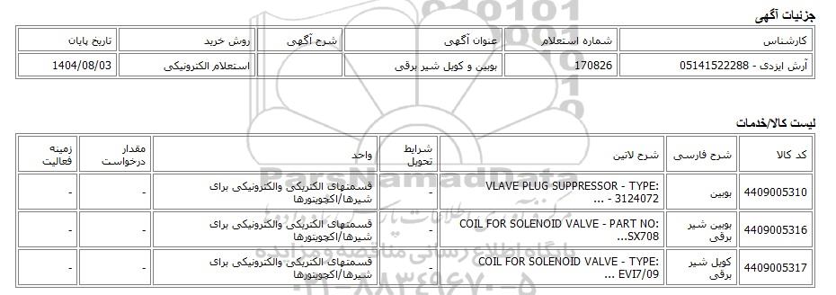 | آرش ایزدی - 05141522288 | 170826 | بوبین و کویل شیر برقی | استعلام الکترونیکی | 1404/08/03 |
