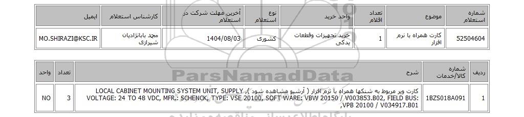 | 52504604 | کارت همراه با نرم افزار | 1 | خرید تجهیزات وقطعات یدکی | کشوری | 1404/08/03 | محمد بابانژادیان شیرازی | MO.SHIRAZI@KSC.IR |