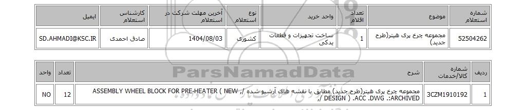 | 52504262 | مجموعه چرخ پری هیتر(طرح جدید) | 1 | ساخت تجهیزات و قطعات یدکی | کشوری | 1404/08/03 | صادق احمدی | SD.AHMADI@KSC.IR |