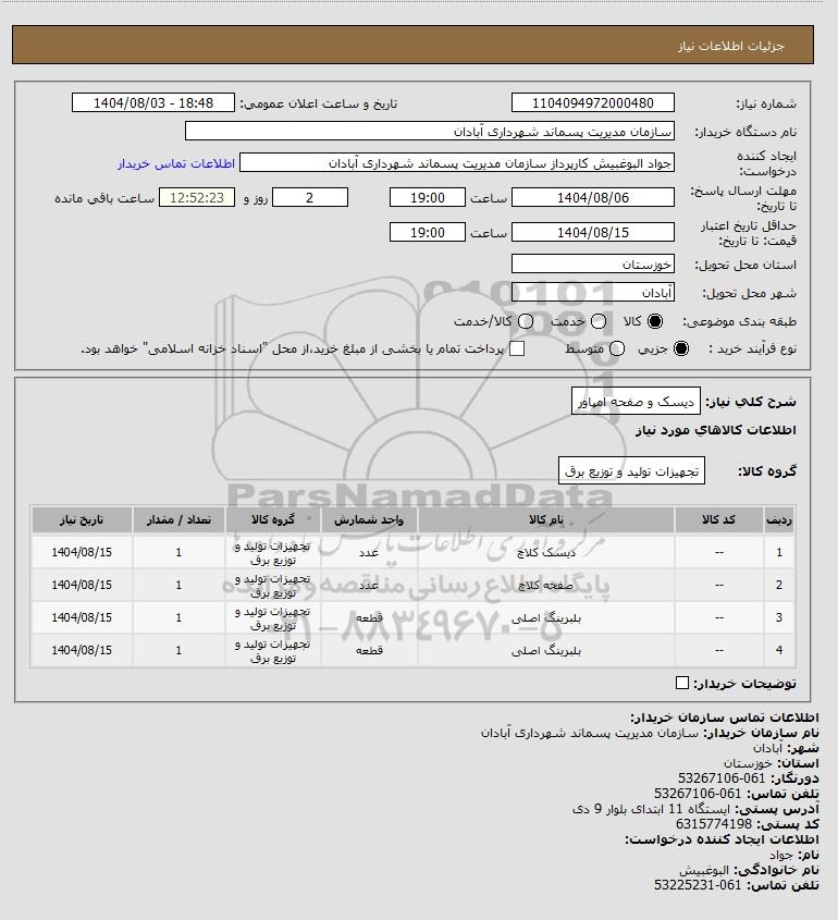 استعلام دیسک و صفحه امپاور، سامانه ستاد- استعلام روز یکشنبه چهارم آبان ماه 1404, استعلام دیسک و صفحه امپاور، سامانه ستاد