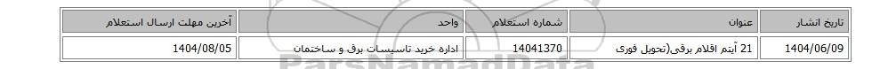 | 1404/06/09 | 21 آیتم اقلام برقی(تحویل فوری | 14041370 | اداره خرید تاسیسات برق و ساختمان | 1404/08/05 |