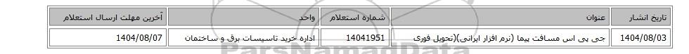 | 1404/08/03 | جی پی اس مسافت پیما (نرم افزار ایرانی)(تحویل فوری | 14041951 | اداره خرید تاسیسات برق و ساختمان | 1404/08/07 |