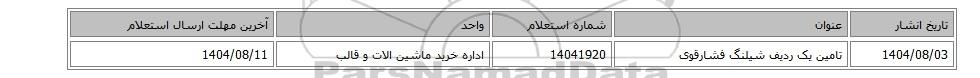 | 1404/08/03 | تامین یک ردیف شیلنگ فشارقوی | 14041920 | اداره خرید ماشین الات و قالب | 1404/08/11 |