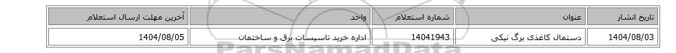 | 1404/08/03 | دستمال کاغذی برگ نیکی | 14041943 | اداره خرید تاسیسات برق و ساختمان | 1404/08/05 |