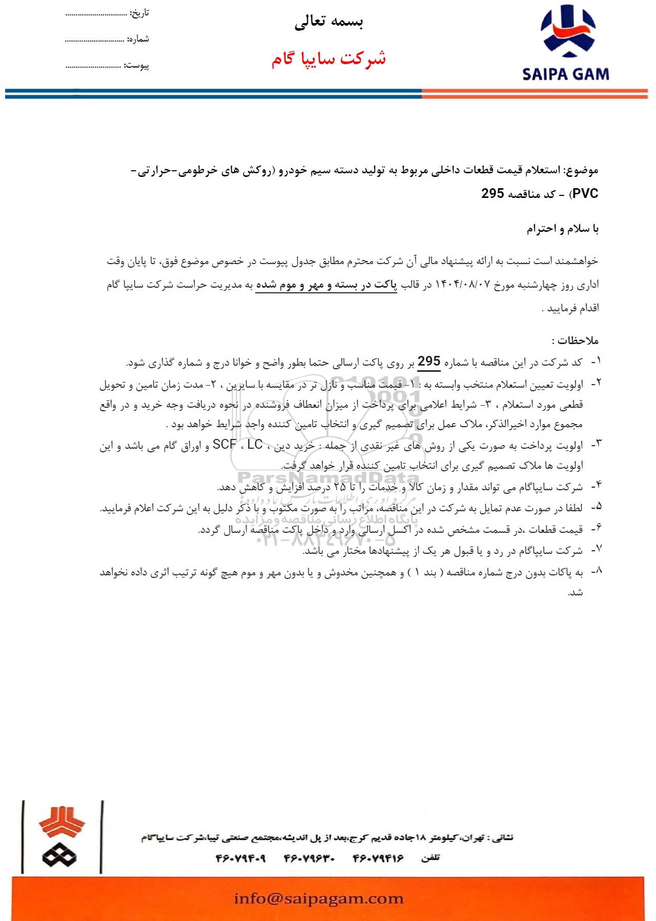 موضوع: استعلام قیمت قطعات داخلی مربوط به تولید دسته سیم خودرو (روکش های خرطومی- حرارتی- PVC) - کد مناقصه 295