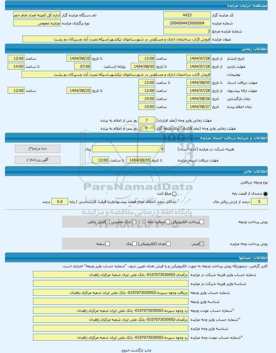 | عنوان مزایده | فروش 5باب ساختمان اداری و مسکونی در شهرستانهای نیکشهر.اسپکه.نصرت آباد وسیرکان بم پشت -مزایده ساختمان - استان سیستان و بلوچستان | |||