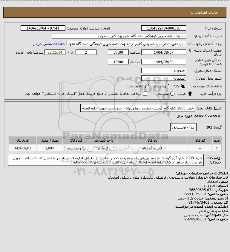 شرح کلی نیاز: خرید 2000 کیلو گرم گوشت منجمد برزیلی ران و سردست جهت اداره تغذیه