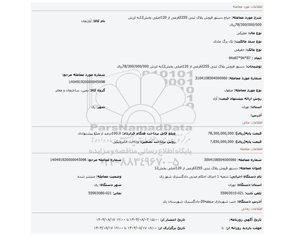 | شرح مورد معامله: حراج دستور فروش پلاک ثبتی 2255فرعی از 120اصلی بخش12به ارزش 78/300/000/000ریال | نام کالا: آپارتمان | |