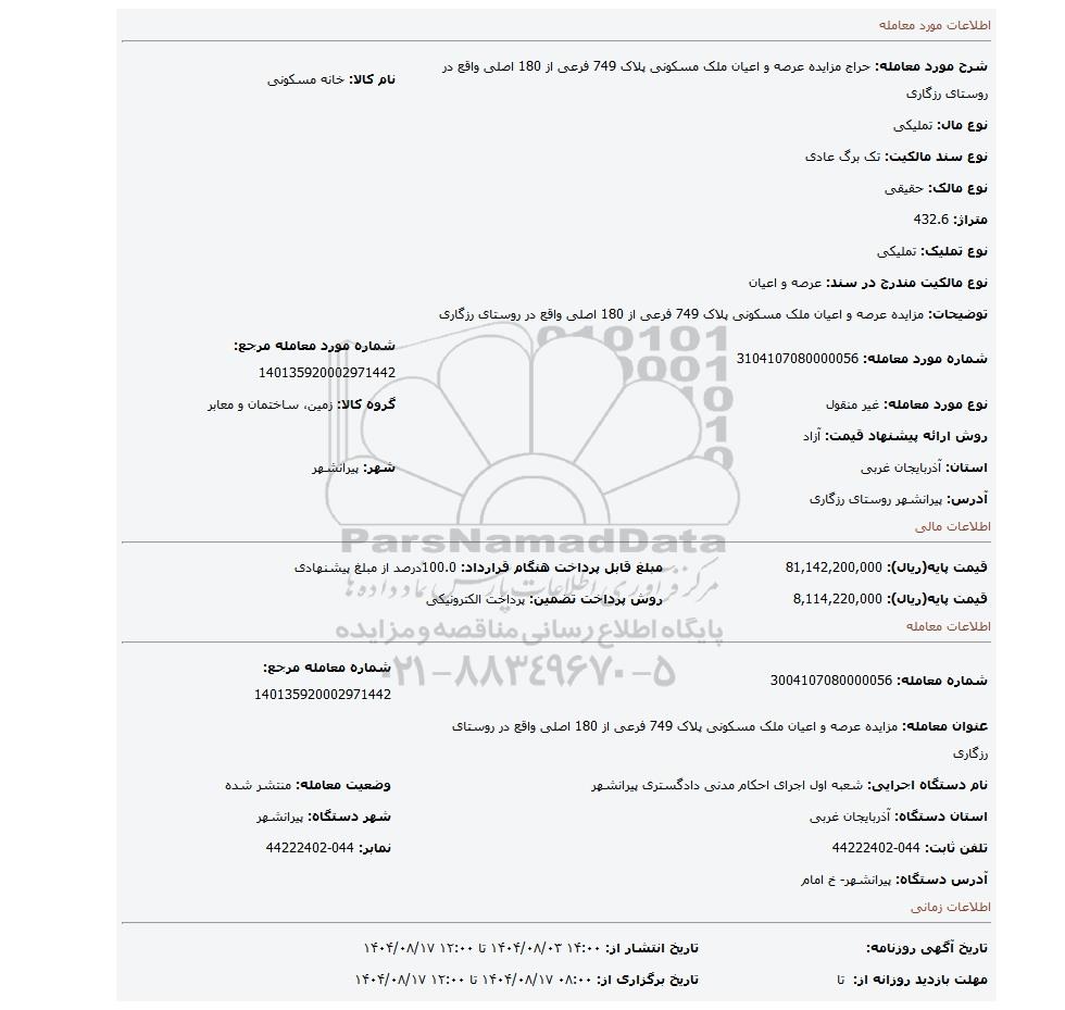 | شماره مورد معامله: 3104107080000056 | شماره مورد معامله مرجع: 140135920002971442 | |
