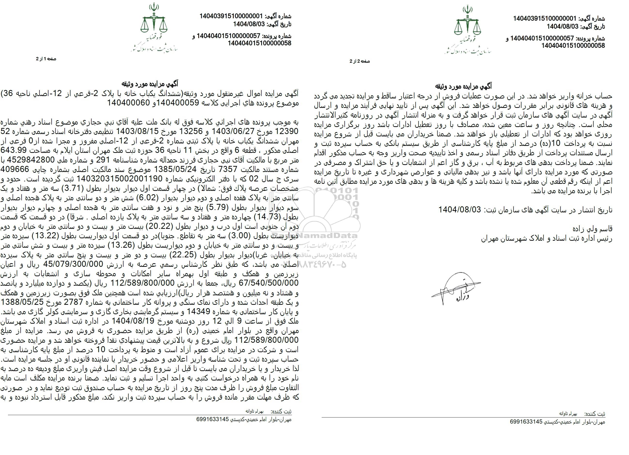 به موجب پرونده های اجرائی کلاسه فوق له بانک ملت علیه آقای نبی حجاری موضوع استاد رهنی شماره 52 12390 مورخ 1403/06/27 و 13256 مورخ 1403/08/15 تنظیمی دفترخانه اسناد رسمی شماره مهران ششدانگ یکباب خانه با پلاک ثبتی شماره 2- فرعی از -12- اصلی مفروز و مجزا شده از 0 فرعی از اصلی مذکور، قطعه 6 واقع در بخش 11 ناحیه 36 حوزه ثبت ملک مهران استان ایلام به مساحت 643.99 متر مربع با مالکیت آقای نبی حجازی فرزند حمداله شماره شناسنامه 291 و شماره ملی 4529842800 با شماره مستند مالکیت 7357 تاریخ 1385/05/24 موضوع سند مالکیت اصلی بشماره چاپی 409666 سری ج سال 02 که با دفتر الکترونیکی شماره 140320315002001190 ثبت گردیده است. حدود و مشخصات عرصه بلاک فوق شمالا در چهار قسمت اول دیوار بدیوار بطول (3.71) سه متر و هفتاد و یک سانتی متر به پلاک هنده اصلی و دوم دیوار بدیوار (6.02) شش متر و دو سانتی متر به پلاک هجده اصلی و سوم دیوار بدیوار بطول (5.79) پنج متر و بود و هفت سانتی متر به هجده اصلی و چهارم دیوار بدیوار بطول (14.73) چهارده متر و هفتاد و سه سانتی متر به پلاک یازده اصلی شرقا در دو قسمت که قسمت دوم آن جنوبی است اول درب و دیوار بطول (20.22) بیست متر و بیست و دو سانتی متر به خیابان و دوم دیواریست بطول (3.00) سه متر به تقاطع جنوبا در دو قسمت اول دیواریست بطول (13.22) سیزده متر و بیست و دو سانتی متر به خیابان و دوم دیواریست بطول 13.26) سیزده متر و بیست و شش سانتی متر به خیابان غربا) دیوار بدیوار بطول (22.25) بیست و دو متر و بیست و پنج سانتی متر به پلاک سپرده اصلی می باشد که طبق نظر کارشناس رسمی عرصه به ارزش 45.079.300.000 ریال و اعیان زیرزمین و همکف و طبقه اول بهمراه سایر امکانات و محوطه سازی و انشعابات به ارزش 67.540.500.000 ریال، جمعا به ارزش 112.589.800.000 ریال یکصد و دوازده میلیارد و پانصد و هشتاد و نه میلیون و هشتصد هزار ریال ارزیابی شده است همچنین ملک فوق بصورت زیرزمین و همکف و یک طبقه احداث شده و دارای نمای سنگی و پروانه کار ساختمانی به شماره 2787 مورخ 1388.05.25 و پایان کار ساختمانی به شماره 14349 و سیستم گرمایشی بخاری گاری و سرمایشی کولر گاری می باشد. ملک فوق از ساعت 9 الی 12 روز دوشنبه مورخ 1404.08.19 در اداره ثبت اسناد و املاک شهرستان مهران واقع در بلوار امام خمینی (ره) از طریق مزایده حضوری به فروش میرسد. مزایده از مبلغ 112.589.800.000 ریال شروع و به بالاترین قیمت پیشنهادی نقداً فروخته خواهد شد و مزایده حضوری است و شرکت در مزایده برای عموم آزاد است و منوط به پرداخت 10 درصد از مبلغ پایه کارشناسی به حساب سپرده ثبت و تحت شناسه واریز اعلامی و حضور خریدار با نماینده قانونی او در جلسه مزایده است. لذا خریدار و با خریداران می بایست تا قبل از شروع وقت مزایده اصل فیش واریزی مبلغ ودیعه ده درصد به نام خود را به همراه درخواست کتبی به واحد اجرا تسلیم و ثبت نماید. ضمنا برنده مزایده مکلف است ما به التفاوت مبلغ فروش را ظرف مدت پنج روز از تاریخ مزایده به حساب صندوق ثبت تودیع نماید و در صورتی که ظرف مهلت مقرر مانده فروش را به حساب سپرده ثبت واریز نکند مبلغ مذکور قابل استرداد نبوده و به حساب خزانه واریز خواهد شد. در این صورت عملیات فروش از درجه اعتبار ساقط و مزایده تجدید می گردد. و هزینه های قانونی برابر مقررات وصول خواهد شد. این اگهی پس از تایید نهایی فرایند مزایده و ارسال آگهی در سایت آگهی های سازمان ثبت قرار خواهد گرفت و به منزله انتشار آگهی در روزنامه کثیر الانتشار محلی است. چنانچه روز و ساعت معین شده مصادف با روز تعطیل ادارات باشد روز برگزاری مزایده روزی خواهد بود که ادارات از تعطیلی باز خواهند شد. ضمنا خریداران می بایست قبل از شروع مزایده اجرا با برنده مزایده می باشد. نسبت به پرداخت (10) ده درصد از مبلغ پایه کارشناسی از طریق سیستم بانکی به حساب سپرده ثبت و ارسال مستندات پرداخت از طریق دفاتر اسناد رسمی و اخذ تاییدیه صحت واریز وجه به حساب مذکور اقدام نمایند. ضمنا پرداخت بدهی های مربوط به آب، برق و گاز اعم از انشعابات و یا حق اشتراک و مصرفی در صورتی که مورد مزای