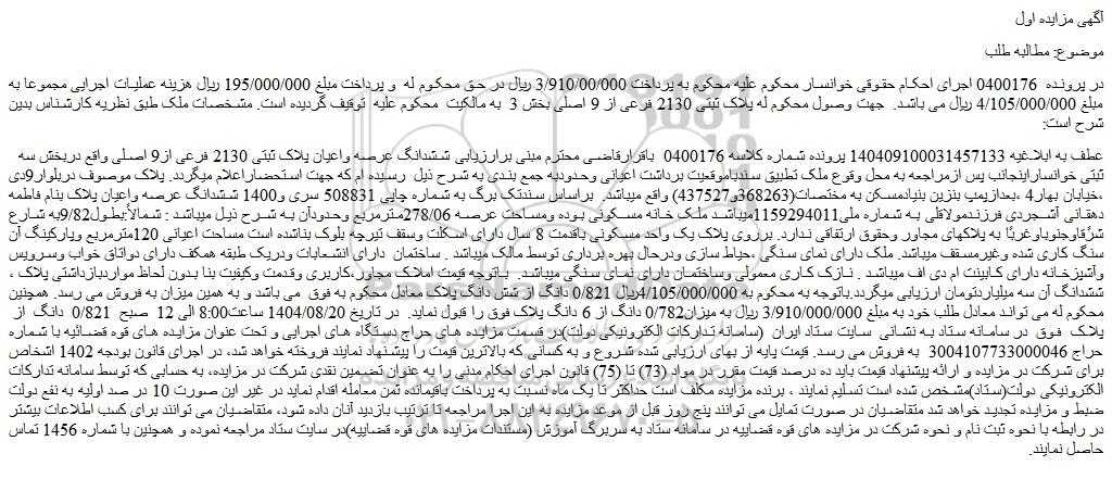 مزایده ششدانگ عرصه واعیان پلاک ثبتی 2130 فرعی از9 اصلی, مزایده ششدانگ عرصه واعیان پلاک ثبتی 2130 فرعی از9 اصلی