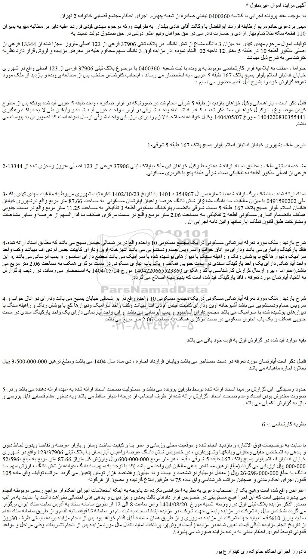 توقیف اموال مرحوم مهدی محمدی به میزان 3 دانگ مشاع از شش دانگ در پلاک ثبتی 37906 فرعی از 123 اصلی مفروز مجزا شده از 13344 فرعی از اصلی مذکور قطعه 10 در طبقه 5 بخش 12 ناحیه 02 اقدام نموده در مزایده فوق 3 دانگ سهم محکوم علیه در معرض مزایده و فروش قرار دارد نظریه کارشناسی به شرح ذیل میباشد