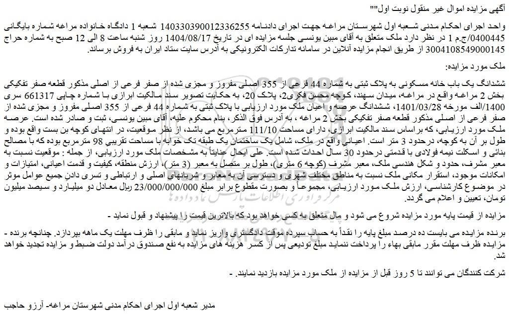 واحد اجرای احکام مدنی شعبه اول شهرستان مراغه جهت اجرای دادنامه 140330390012336255 شعبه 1 دادگاه خانواده مراغه شماره بایگانی 0400445/ج.م 1 در نظر دارد ملک متعلق به آقای مبین یونسی جلسه مزایده ای در تاریخ 1404/08/17 روز شنبه ساعت 8 الی 12 صبح به شماره حراج 3004108549000145 از طریق انجام مزایده آنلاین در سامانه تدارکات الکترونیکی به آدرس سایت ستاد ایران به فروش برساند.