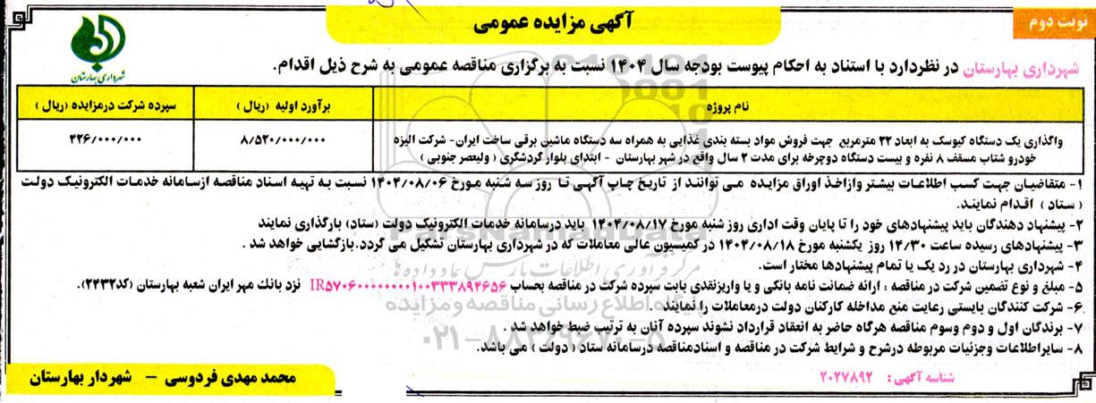 مزایده واگذاری یک دستگاه کیوسک به ابعاد 22 مترمربع جهت فروش مواد بسته بندی غذایی ... ​​​​​​​نوبت دوم , مزایده واگذاری یک دستگاه کیوسک به ابعاد 22 مترمربع جهت فروش مواد بسته بندی غذایی ... ​​​​​​​نوبت دوم