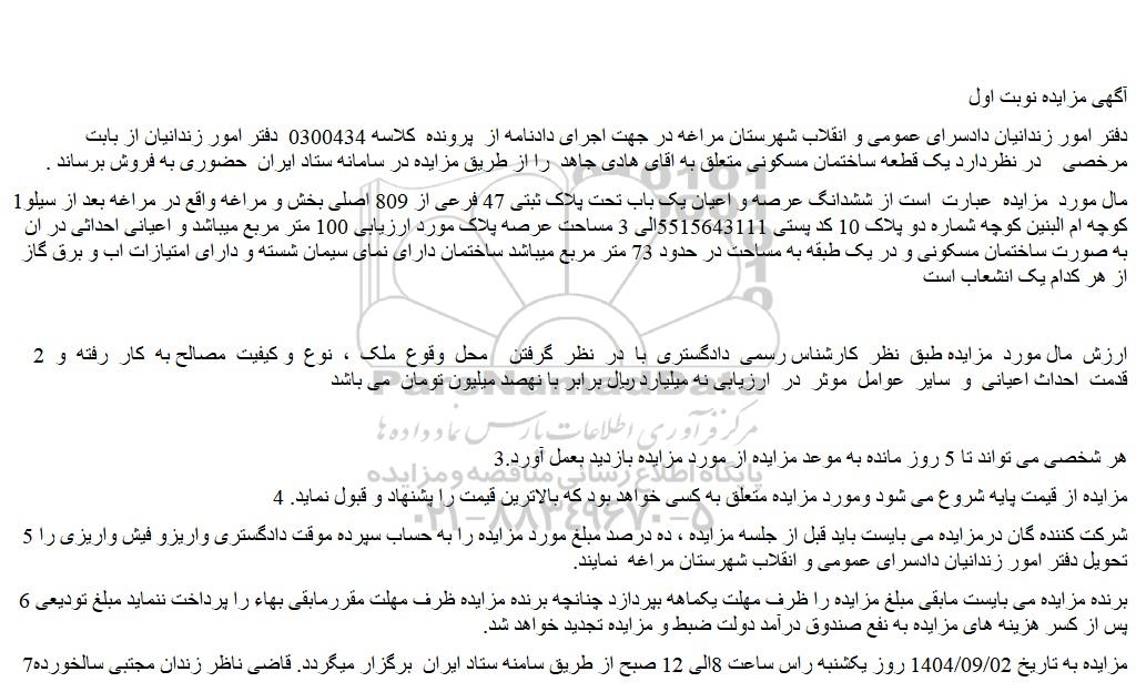 دفتر امور زندانیان دادسرای عمومی و انقلاب شهرستان مراغه در جهت اجرای دادنامه از پرونده کلاسه 0300434 دفتر امور زندانیان از بابت مرخصی در نظردارد یک قطعه ساختمان مسکونی متعلق به اقای هادی جاهد را از طریق مزایده در سامانه ستاد ایران حضوری به فروش برساند .