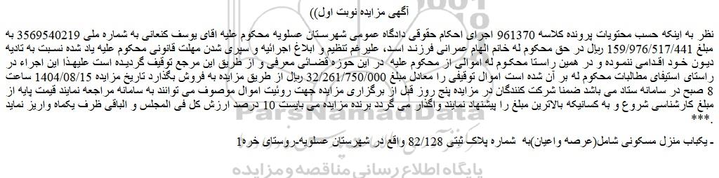 نظر به اینکه حسب محتویات پرونده کلاسه 961370 اجرای احکام حقوقی دادگاه عمومی شهرستان عسلویه محکوم علیه اقای یوسف کنعانی به شماره ملی 3569540219 به مبلغ 159/976/517/441 ریال در حق محکوم له خانم الهام عمرانی فرزند اسد، علیرغم تنظیم و ابلاغ اجرائیه و سپری شدن مهلت قانونی محکوم علیه یاد شده نسبت به تادیه دیون خود اقدامی ننموده و در همین راستا محکوم له اموالی از محکوم علیه در این حوزه قضائی معرفی و از طریق این مرجع توقیف گردیده است علیهذا این اجراء در راستای استیفای مطالبات محکوم له بر آن شده است اموال توقیفی را معادل مبلغ 32/261/750/000 ریال از طریق مزایده به فروش بگذارد تاریخ مزایده 1404/08/15 ساعت 8 صبح در سامانه ستاد می باشد ضمنا شرکت کنندگان در مزایده پنج روز قبل از برگزاری مزایده جهت روئیت اموال موصوف می توانند به سامانه مراجعه نمایند قیمت پایه از مبلغ کارشناسی شروع و به کسانیکه بالاترین مبلغ را پیشنهاد نمایند واگذار می گردد برنده مزایده می بایست 10 درصد ارزش کل فی المجلس و الباقی ظرف یکماه واریز نماید .***