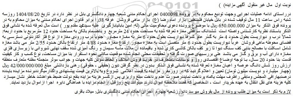درراستای ادامه عملیات اجرایی وجهت تودیع محکوم به در پرونده 0400098 اجرای احکام مدنی شعبه چهارم دادگستری بابل در نظر دارد در تاریخ 1404/08/20 روزسه شنبه راس ساعت 11 مال توقیف شده در بابل خیابان فلسطین بازار امام رضا (ع) بازار ماهی فروشان غرفه 38را برابر قانون اجرای احکام مدنی به میزان محکوم به در پرونده فوق الذکر به میزان 650.000.000 ریال با موضوع پرونده دعوی محکومیت مالی (له: امین بابانیابازگیری علیه سیدمحمد مقدم پور ) است مال تعرفه شده به نشانی فوق الذکر باستناد نظریه کارشناس واصله است ششدانک سرقفلی مغازه تعرفه شده به مساحت حدود 24 مترمربع و بانضمام بالکن به مساحت حدود 12 مترمربع با حدود اربعه: شمالاً درب و دیواریست بطول حدود 4 متر به گذر عام شرقاً دیواریست بطول حدود 6 متر به مغازه مجاور جنوباً درب ورودی مغازه از نوع فلز آکاردئونی دسترسی به فضای محوطه ماهی فروشان غرباً دیواریست بطول حدود 6 متر متصل است به مغازه مجاور ارتفاع مغازه حدود 4/88 متر ارتفاع بالکن حدود 2/55 متر می باشد مغازه شامل اسکلت با مصالح بنایی کف سنگ دیوا تا زیر کف بالکن کاشی کاری شده و باقیمانده آن ملات ماسه سیمان و رنگ آمیزی شده سقف نهایی شیروانی با زیرسازی فلزی مغازه دارای آب و برق و گاز می باشد طی بررسیهای صورت گرفته و تحقیقات محلی انجام شده موقعیت مکانی نحوه استقرار بنا میزان مساحت، نوع کسب و کار کیفیت قدمت بنا حدود 20 سال، با توجه اوضاع اقتصادی روز و نوسانات نامتعارف در خرید فروش املاک و لحاظ نمودن کلیه جهات و جوانب موثر منجمله مظنه متعارف منطقه ارزش روز شش دانگ عرصه و اعیان مغازه تعرفه شده به نشانی فوق الذکر بدون در نظر گرفتن دیون (حقیقی ، حقوقی) رهنی بازداشتی مبلغ 42/000/000/000 ریال (چهار میلیارد و دویست میلیون تومان) تعیین و اعلام گردید که در روزمقرر مزایده به قیمت اعلامی شروع وبه بالاترین قیمت پیشنهادی واگذارمیگرددبرنده مزایده بایدده درصدبهارافی المجلس ومابقی راظرف مهلت یکماه پرداخت نمایددرصورت عدم پرداخت مبلغ واریزی پس ازکسرهزینه مزایده بنفع دولت ضبط خواهدشد خاطر نشان میسازد کلیه هزینه های نقل انتقال به عهده خریدار است ، اشخاصی که قصد ملاحظه اموال دارند میتوانند پنج روزقبل ازانجام مزایده با هماهنگی دایره اجرا ازاموال بازدید نمایند.