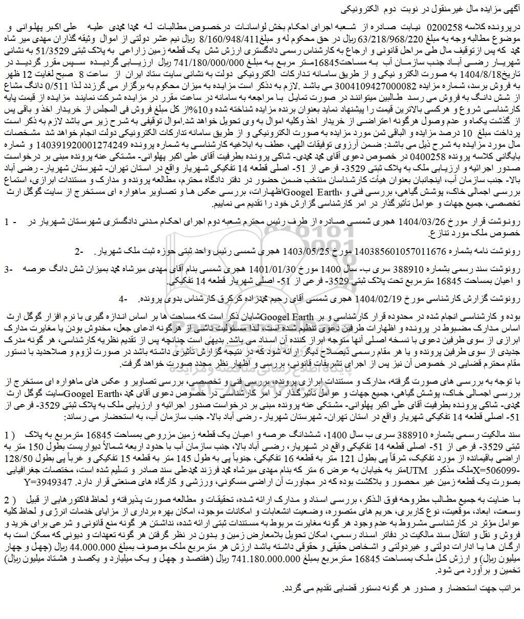 درپرونده کلاسه 0200258 نیابت صادره از شعبه اجرای احکام بخش لواسانات درخصوص مطالبات له محمدا محمدی علیه علی اکبر پهلوانی و موضوع مطالبه وجه به مبلغ 63/218/968/220 ریال در حق محکوم له و مبلغ8/160/948/411 ریال نیم عشر دولتی از اموال وثیقه گذاران مهدی میر شاه محمد که پس ازتوقیف مال طی مراحل قانونی و ارجاع به کارشناس رسمی دادگستری ارزش شش یک قطعه زمین زاراعی به پلاک ثبتی 51/3529 به نشانی شهریار رضی آباد جنب سازمان آب به مساحت16845متر مربع به مبلغ 741/180/000/000 ریال ارزیابی گردیده سپس مقرر گردید در تاریخ1404/8/18 به صورت الکترو نیکی و از طریق سامانه تدارکات الکترونیکی دولت به نشانی سایت ستاد ایران از ساعت 8 صبح لغایت 12 ظهر به فروش برسد، شماره مزایده 3004109427000082 می باشد .لازم به دذکر است مزایده به میزان محکوم به برگزار می گرزدد لذا 0/511 دانگ مشاع از شش دانگ به فروش می رسد طالبین میتوانند در صورت تمایل با مراجعه به سامانه در ساعت مقرر در مزایده شرکت نمایند مزایده از قیمت پایه کارشناسی شروع و هرکسی بالاترین قیمت را پیشنهاد نماید بعنوان برنده مزایده شناخته شده و10%از کل مبلغ فروش فی المجلس از خریدار اخذ و باقی پس از گذشت یکماه و عدم وصول هرگونه اعتراضی از خریدار اخذ وکلیه اموال به وی تحویل خواهد شد.اموال توقیفی به شرح زیر می باشد لازم به ذکر است پرداخت مبلغ 10 درصد مزایده و الباقی ثمن مورد مزایده به صورت الکترونیکی و از طریق سامانه تدارکات الکترونیکی دولت انجام خواهد شد مشخصات مال مورد مزایده به شرح ذیل می باشد: ضمن آرزوی توفیقات الهی، عطف به ابلاغیه کارشناسی به شماره پرونده 140391920001274249 و شماره بایگانی کلاسه پرونده 0400258 در خصوص دعوی آقای محمد محمدی- شاکی پرونده بطرفیت آقای علی اکبر پهلوانی- مشتکی عنه پرونده مبنی بر درخواست صدور اجرائیه و ارزیابی ملک به پلاک ثبتی 3529- فرعی از 51- اصلی قطعه 14 تفکیکی شهریار واقع در استان تهران- شهرستان شهریار- رضی آباد بالا- جنب سازمان آب، اینجانبان بعنوان هیأت کارشناسان منتخب ضمن حضور در دفتر دادگاه محترم، مطالعه پرونده و مدارک و مستندات ابرازی، استماع اظهارات، بررسی عکس ها و تصاویر ماهواره ای مستخرج از سایت گوگل ارث googel earth، بررسی اجمالی خاک، پوشش گیاهی، بررسی فنی و تخصصی، جمیع جهات و عوامل تأثیرگذار در امر کارشناسی گزارش خود را تقدیم می نماییم.
