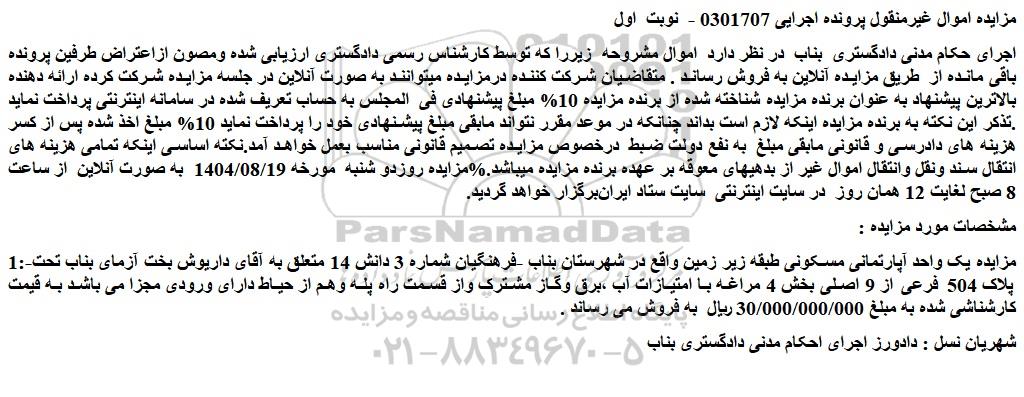مزایده اموال غیرمنقول پرونده اجرایی 0301707 -  نوبت  اول