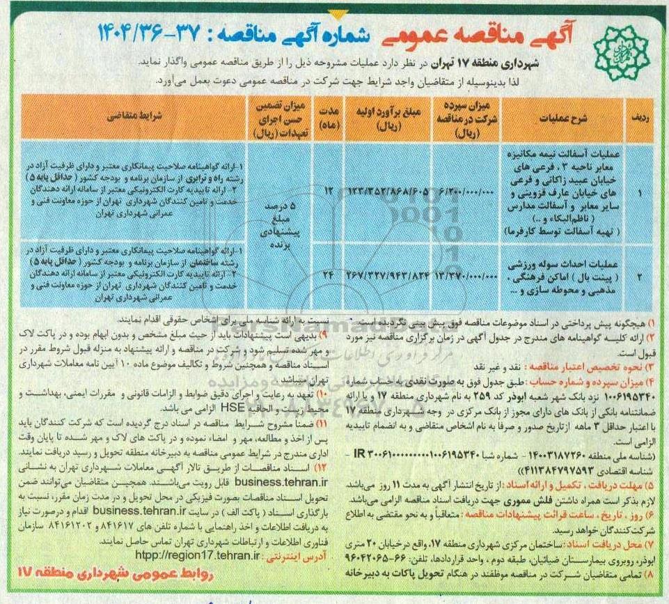 شهرداری منطقه 17 تهران در نظر دارد عملیات مشروحه ذیل را از طریق مناقصه عمومی واگذار نماید. لذا بدینوسیله از متقاضیان واجد شرایط جهت شرکت در مناقصه عمومی دعوت بعمل می آورد.