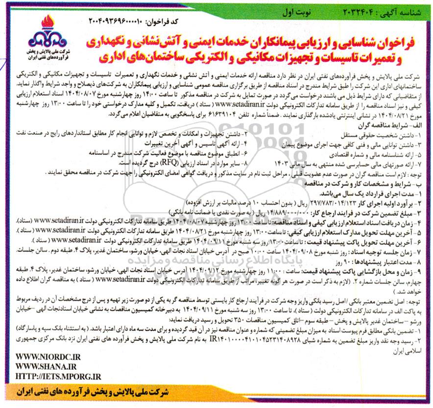 شرکت ملی پالایش و پخش فرآورده های نفتی ایران در نظر دارد مناقصه ارائه خدمات ایمنی و آتش نشانی و خدمات نگهداری و تعمیرات تاسیسات و تجهیزات مکانیکی و الکتریکی ساختمانهای اداری این شرکت را طبق شرایط مندرج در اسناد مناقصه از طریق برگزاری مناقصه عمومی شناسایی و ارزیابی پیمانکاران به شرکتهای ذیصلاح و واجد شرایط واگذار نماید. از متقاضیانی که دارای شرایط ذیل میباشند درخواست می گردد در صورت تمایل به شرکت در مناقصه مذکور تا ساعت 14 روز چهارشنبه مورخ 1404.8.7 اسناد استعلام ارزیابی کیفی و نیز اسناد مناقصه را از طریق سامانه تدارکات الکترونیکی دولت سایت ستاد ایران (ستاد) دریافت، تکمیل و کلیه مدارک درخواستی خود را تا ساعت 13 روز چهارشنبه مورخ 1404.8.21 در نشانی اینترنتی یاد شده بارگذاری نمایند. ضمناً شماره تلفن 61639104 برای پاسخگویی به متقاضیان اعلام می گردد.