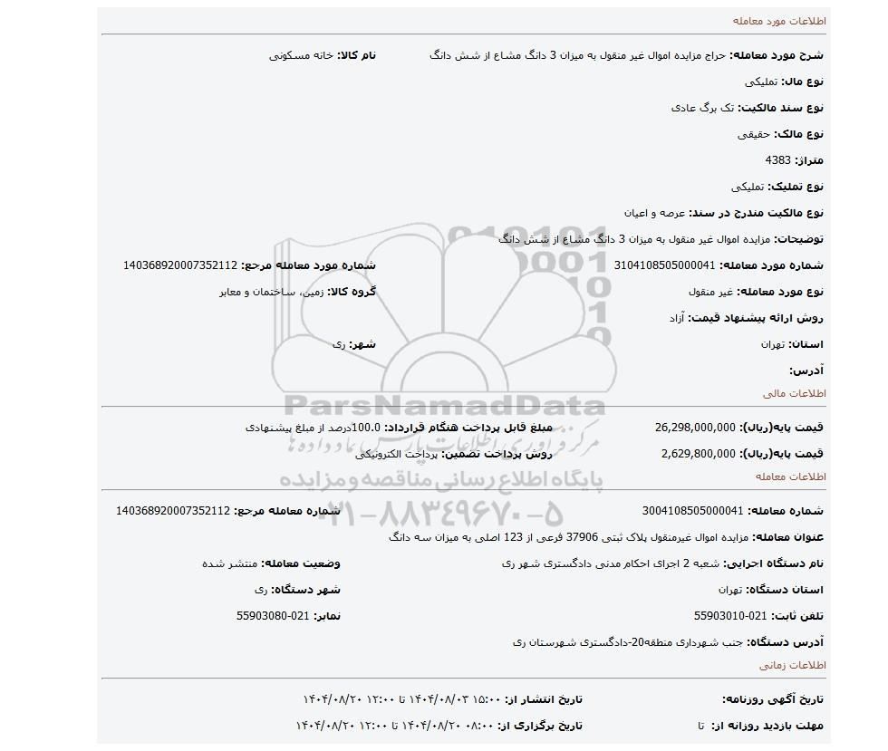 | شماره مورد معامله: 3104108505000041 | شماره مورد معامله مرجع: 140368920007352112 | |