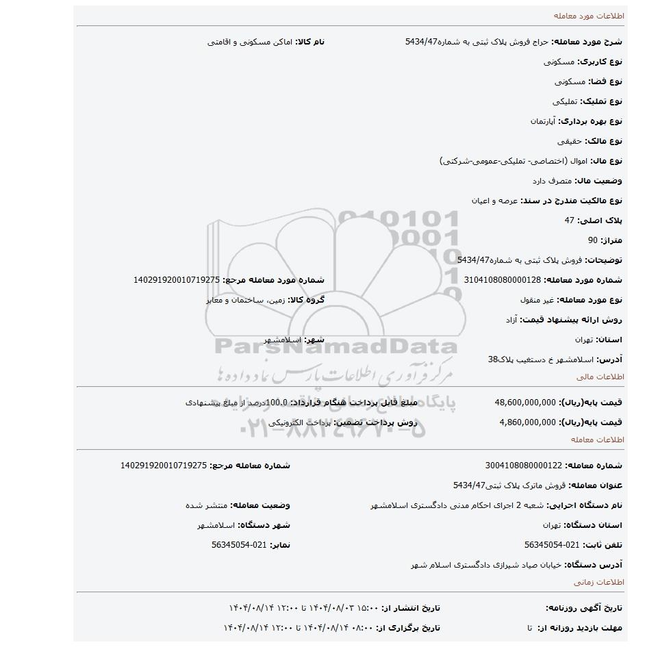 مزایده، فروش پلاک ثبتی به شماره5434/47
